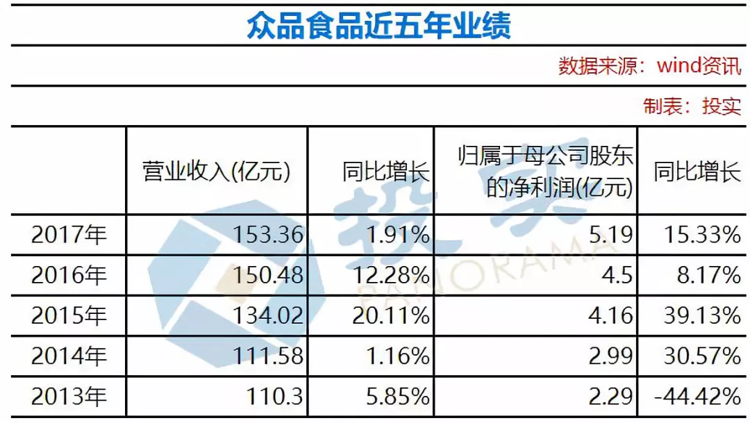2017年,眾品食品實(shí)現(xiàn)營(yíng)業(yè)收入153.36億元,同比增長(zhǎng)1.91%,歸屬于母公司股東的凈利潤(rùn)5.19億元,毛利率9.44%。