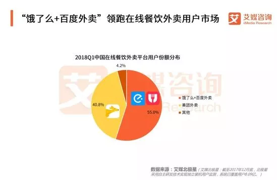 iiMedia Research(艾媒咨詢)數(shù)據(jù)顯示,在2018年第一季度,餓了么與百度外賣仍占優(yōu)勢,市場用戶份額占比達(dá)55.0%,美團(tuán)外賣占比40.8%緊隨其后,市場格局兩家獨大。