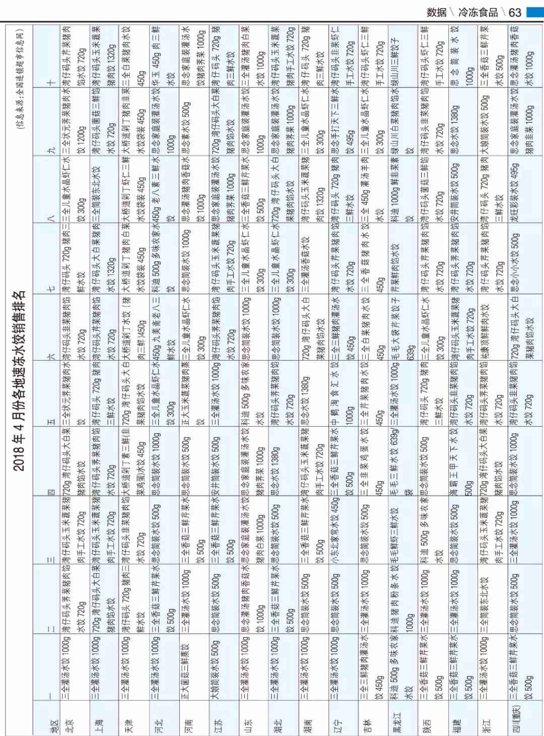 備注:該排名由全國連鎖超市信息網提供,數據來源于全國300多家大中小型超市系統的近2000家門店的冷凍食品銷量,不包含百貨商場及其他小店。各省份門店樣本數量不盡一致,排名情況,僅供參考。