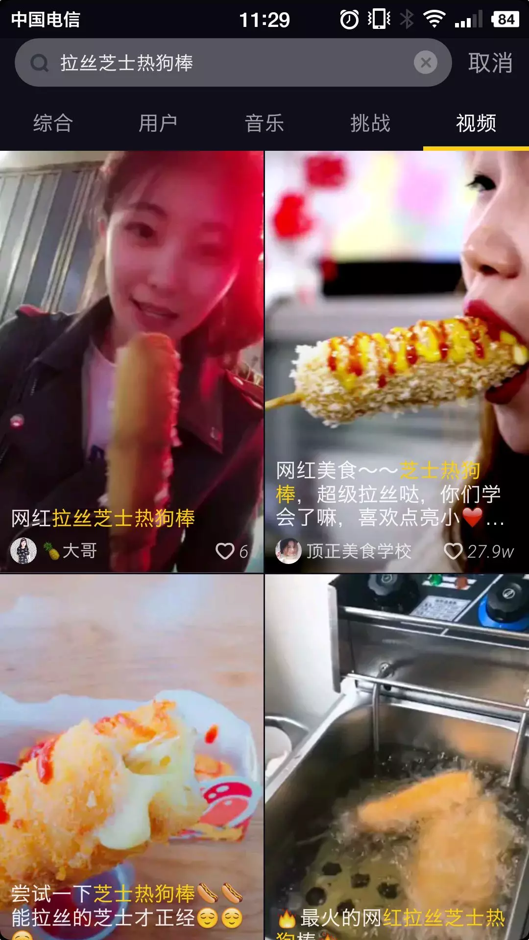 打開抖音,輸入關鍵詞“拉絲芝士熱狗棒”,由來自全國各地的美食愛好者們分享的教學視頻就會出現在下面。在這些時長15秒的短視頻中,分享者們會提前準備好各種材料,然后步驟清晰、手法熟練地演示制作方法,整個過程看上去簡單易學,即使“廚房黑洞星人”也能快速上手。
