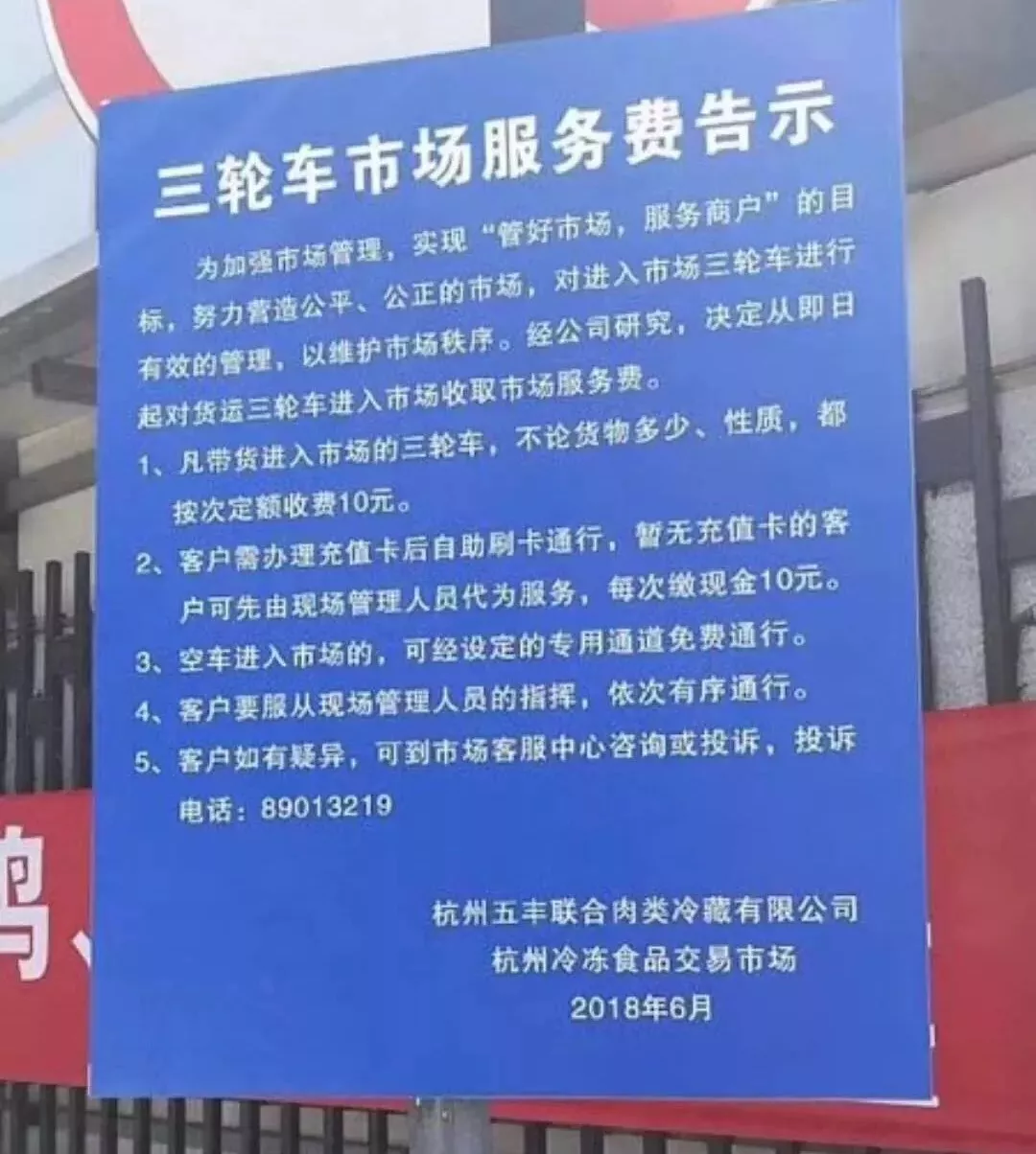 6月初,杭州五豐聯合肉類冷藏有限公司、杭州冷凍食品交易市場的一則“三輪車市場服務費”告示在經銷商群體中引起了軒然大波!按照告示上的收費標準,帶貨三輪車進一次市場要收費10元。