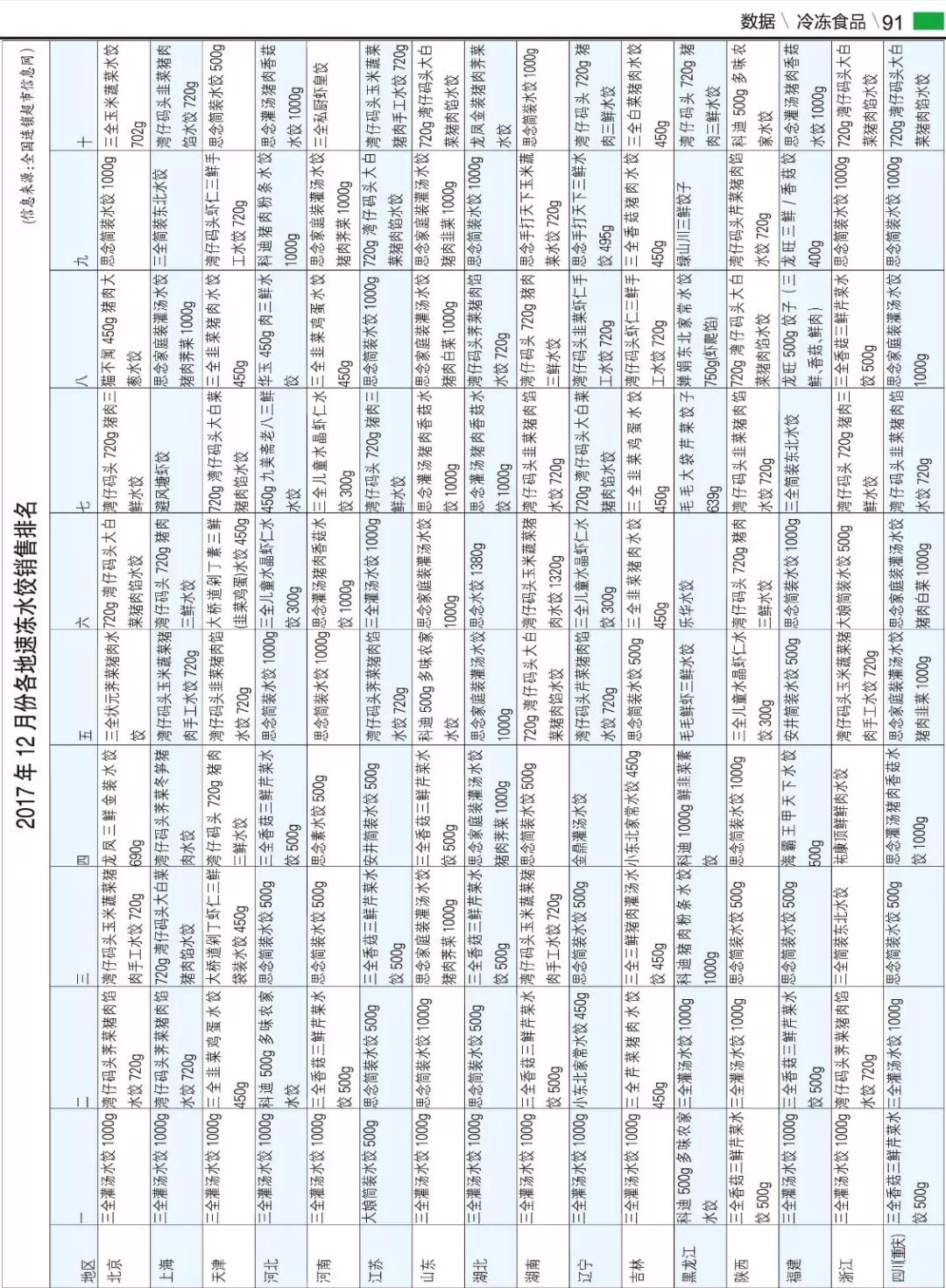 來源: 冷凍食品網(wǎng) 發(fā)布者:冷凍食品▼2017年12月份各地速凍水餃銷售排名