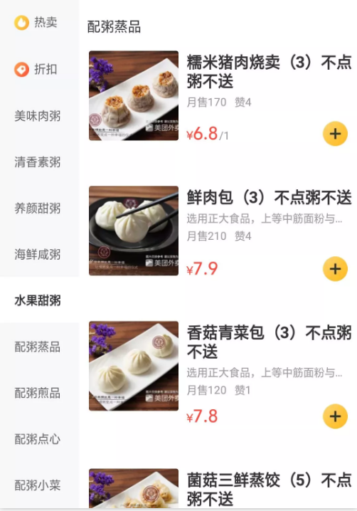 在美團(tuán)上,簡單翻看幾家粥店,我們就可以發(fā)現(xiàn),眼下火熱的“粥時(shí)代”,的確藏了不少關(guān)于速凍食品的商機(jī),很多粥店在賣粥的同時(shí),都會搭配很多諸如燜面、餅、油條、蒸餃、奶黃包、燒麥、包子等食物,名義上是配餐,實(shí)際上市場銷量是非常可觀的。