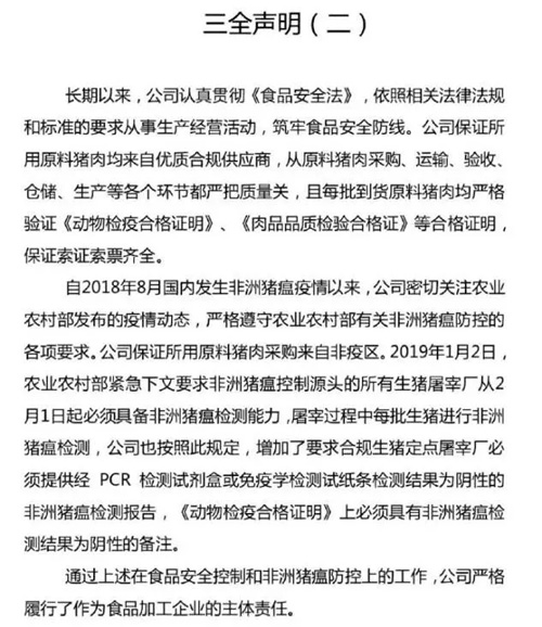 來源: 冷凍食品網(wǎng) 發(fā)布者:編輯昨天(20日)下午,三全食品通過新浪微博發(fā)布聲明稱,作為食品加工企業(yè),公司會主動承擔(dān)更多的社會責(zé)任,主動進行合規(guī)原料豬肉進廠二次非洲豬瘟檢測,將對原料豬肉“批批檢”,最大程度地對消費者負責(zé)。