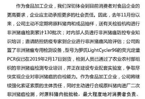 三全食品稱, 公司購置的非洲豬瘟專用檢測設(shè)備已于2月17日到貨,檢測人員也已通過了農(nóng)業(yè)農(nóng)村部組織的非洲豬瘟檢測專業(yè)培訓(xùn),并正在建設(shè)專業(yè)配套實驗室,爭取盡快實現(xiàn)企業(yè)對非洲豬瘟的自檢能力。