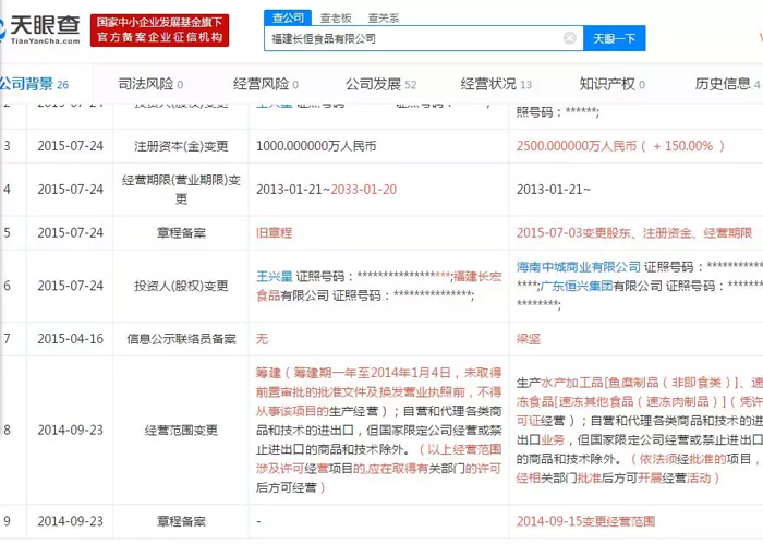 變更經營范圍不到一年時間,2015年7月24日,長恒食品投資人(股權)就由王興星變更為廣東恒興集團有限公司和海南中城商業有限公司。