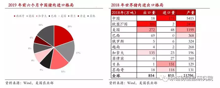 當前,我國豬肉進口的主要來源國分別是西班牙(20%)、德國(17%)、加拿大(16%)和巴西(9%)。就2018年世界主要豬肉出口國家的產量和出口潛力來看,歐盟、加拿大、美國和巴西是最有望增加對中國出口的國家和地區。但2019年6月加拿大出口中國豬肉瘦肉精超標,中國因此暫停從加拿大進口豬肉。