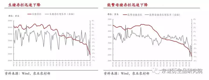 就農業部的數據來看,當前生豬和母豬的存欄量仍在持續下滑,斷崖式下跌的形勢仍沒有緩和。截至今年6月,生豬存欄量24207萬頭,能繁母豬存欄2376萬頭,同比分別下降25.8%和26.7%。