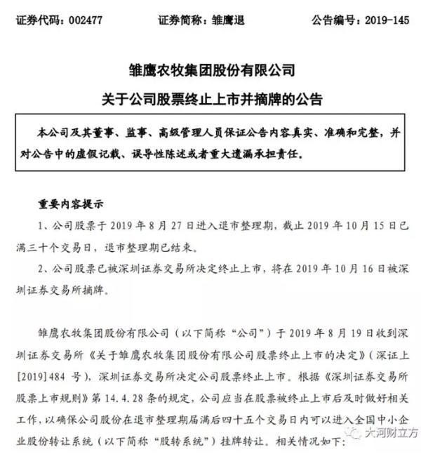 剛剛!雛鷹農(nóng)牧集團(tuán)股份有限公司(以下簡(jiǎn)稱(chēng)雛鷹農(nóng)牧)發(fā)布公告,宣告其股票已被深交所決定終止上市,將在2019年10月16日被深交所摘牌。
