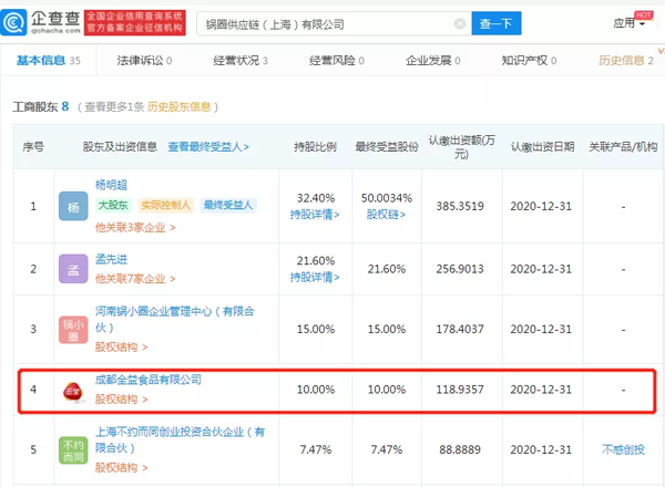 冷食君在企查查上查詢到,鍋圈供應鏈(上海)有限公司成立于2019年07月11日,部分股權(quán)結(jié)構(gòu)如下,其中的成都全益食品有限公司即為三全食品的子公司。