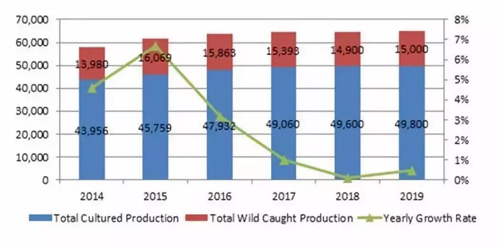 △2014-2019年中國海產產量及增長率。數據來源:國家統計局