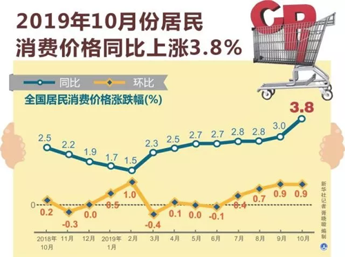 11月9日,國家統計局發布數據稱,10月份,全國居民消費價格(CPI)同比上漲3.8%,漲幅比上月擴大0.8個百分點。