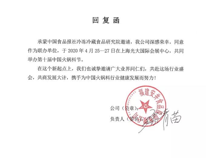 應中國食品報社冷凍冷藏食品研究院/第十屆中國火鍋料節組委會邀請,安井、三全快廚、海欣、惠發、海霸王、千味央廚、升隆、鴻津、佳士博、源香、福春園等組成“最強陣營”,成為2020年第十屆中國火鍋料節聯合承辦單位。