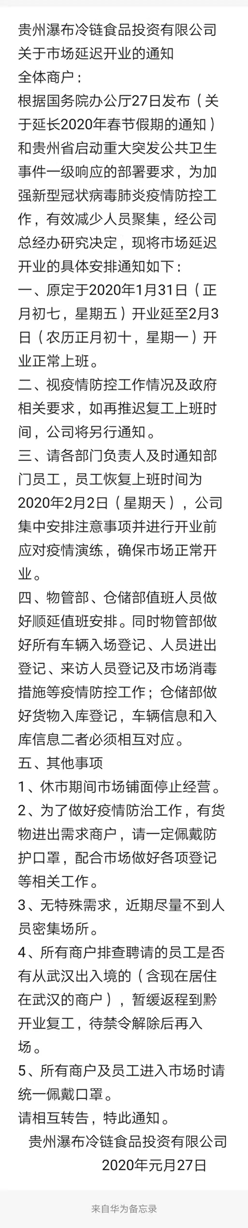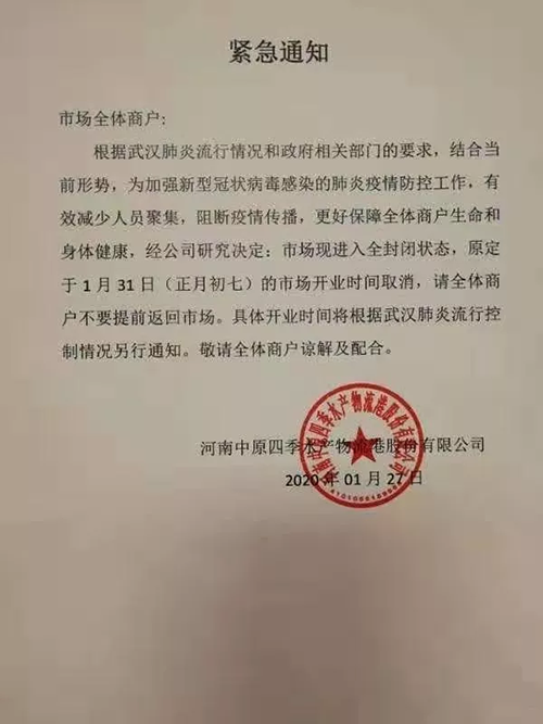 河南中原四季水產物流港也在昨天發布緊急通知,延期開市。