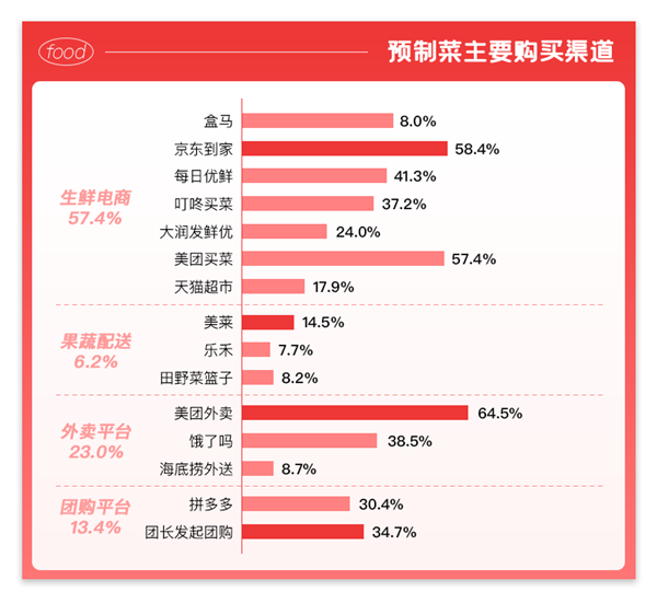 生鮮電商平臺(tái)和外賣平臺(tái)是大家主要購(gòu)買預(yù)制菜的渠道。