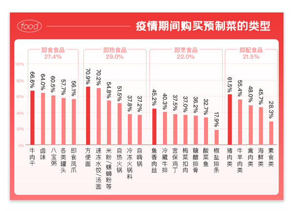 隔離期間以方便面、速凍水餃、牛肉干、八寶粥為代表的即熱食品和即食食品持續(xù)熱銷,這些類型菜品具備“食用方便”和“儲(chǔ)存時(shí)間長(zhǎng)”的特點(diǎn),深受消費(fèi)者歡迎;