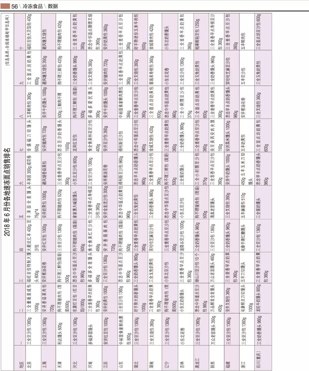 ▼2018年6月份各地速凍面點銷售排名
