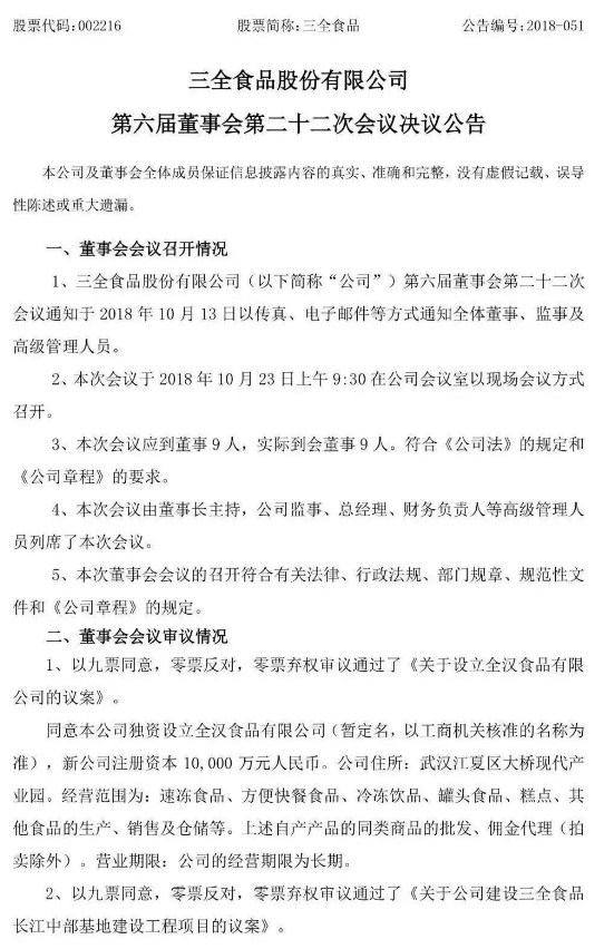 10月23日,速凍食品行業大佬——三全食品發布公告稱,擬投資8億元在武漢建設長江中部基地,進一步布局全國市場。