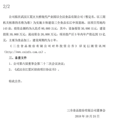 三全食品公告透露,選擇在武漢建廠,是為了靠近消費市場。