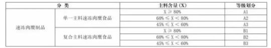由此,單一主料速凍肉糜食品分為A1、A2、A3,復合主料速凍肉糜食品共分為B1、B2、B3。一級主料含量大于等于80%;二級主料含量在60%到80%之間;三級的主料含量在45%到60%之間。