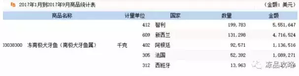 向中國出口銀鱈魚的國家主要有智利、新西蘭、阿根廷、法國、西班牙等,出口量和金額如下: