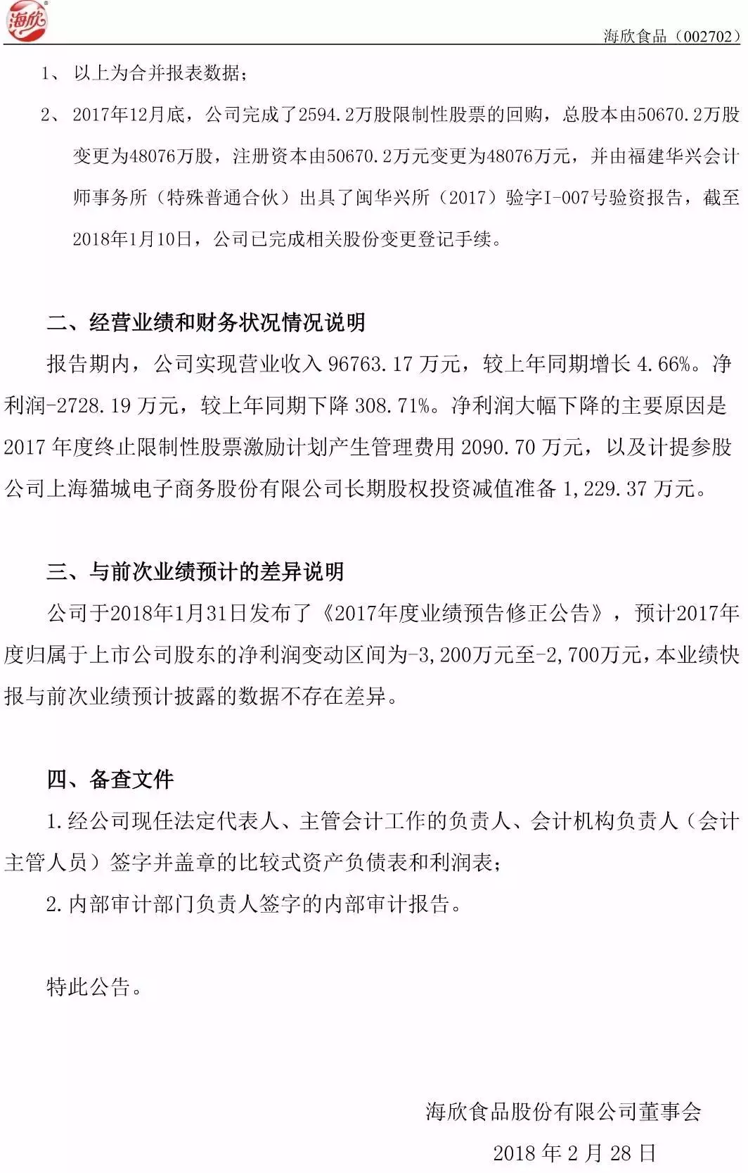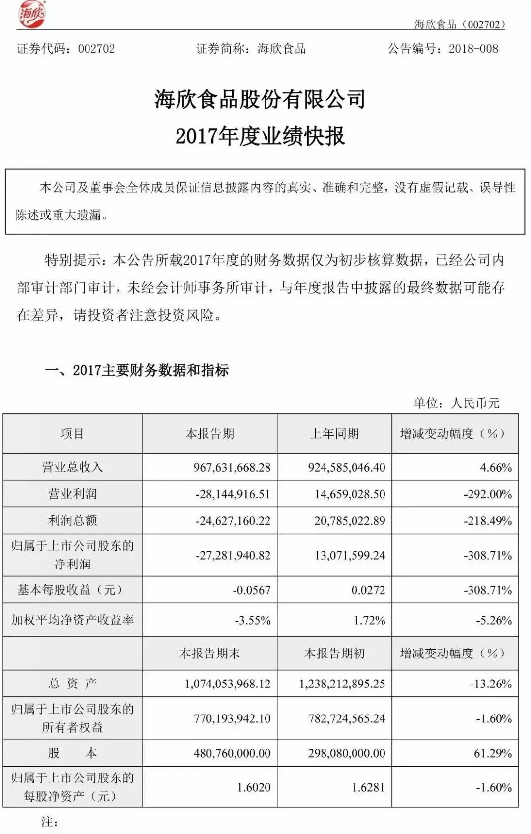 2月28日,海欣食品股份有限公司發布2017年度業績快報,經初步核算,報告期內,公司實現營業收入96763.17萬元,較上年同期增長4.66%,營業利潤2814.49萬元,較上年同期下降292%。歸屬上市公司股東的凈利潤-2728.19萬元,較上年同期下降308.71%。